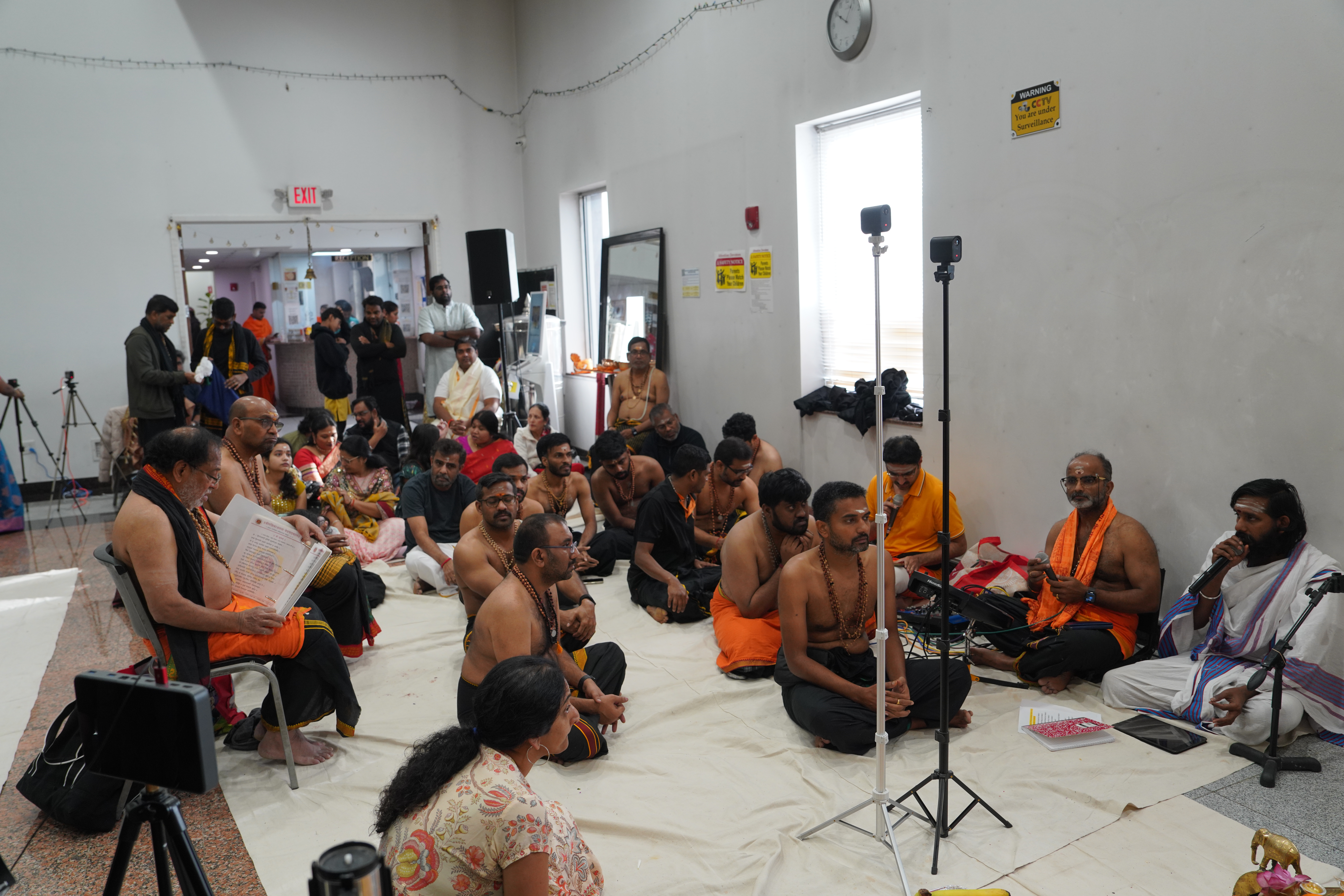 Place sacred rice in your palm and, with a spoon of water, leave it into the arghyapatram (sacred vessel) while chanting: