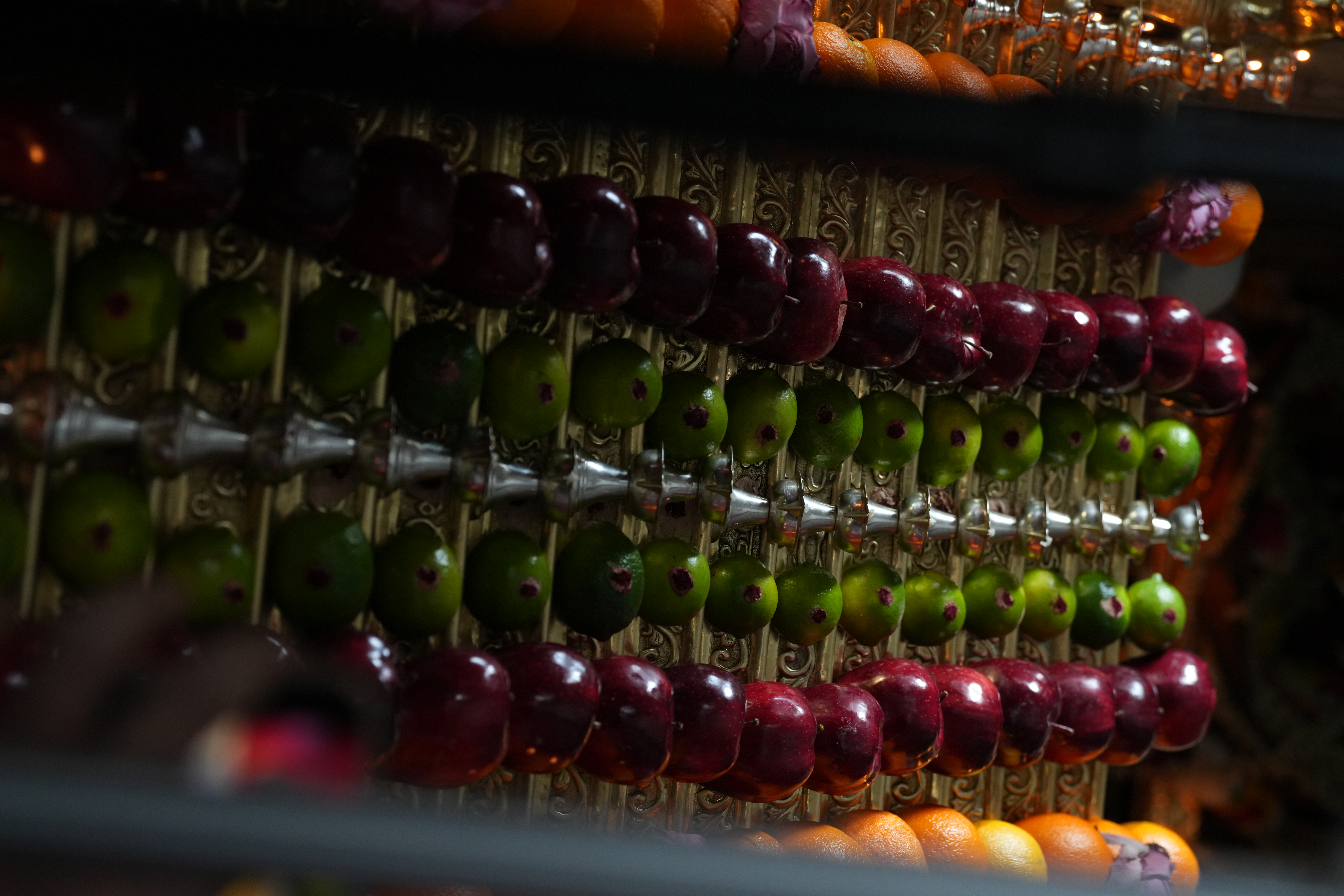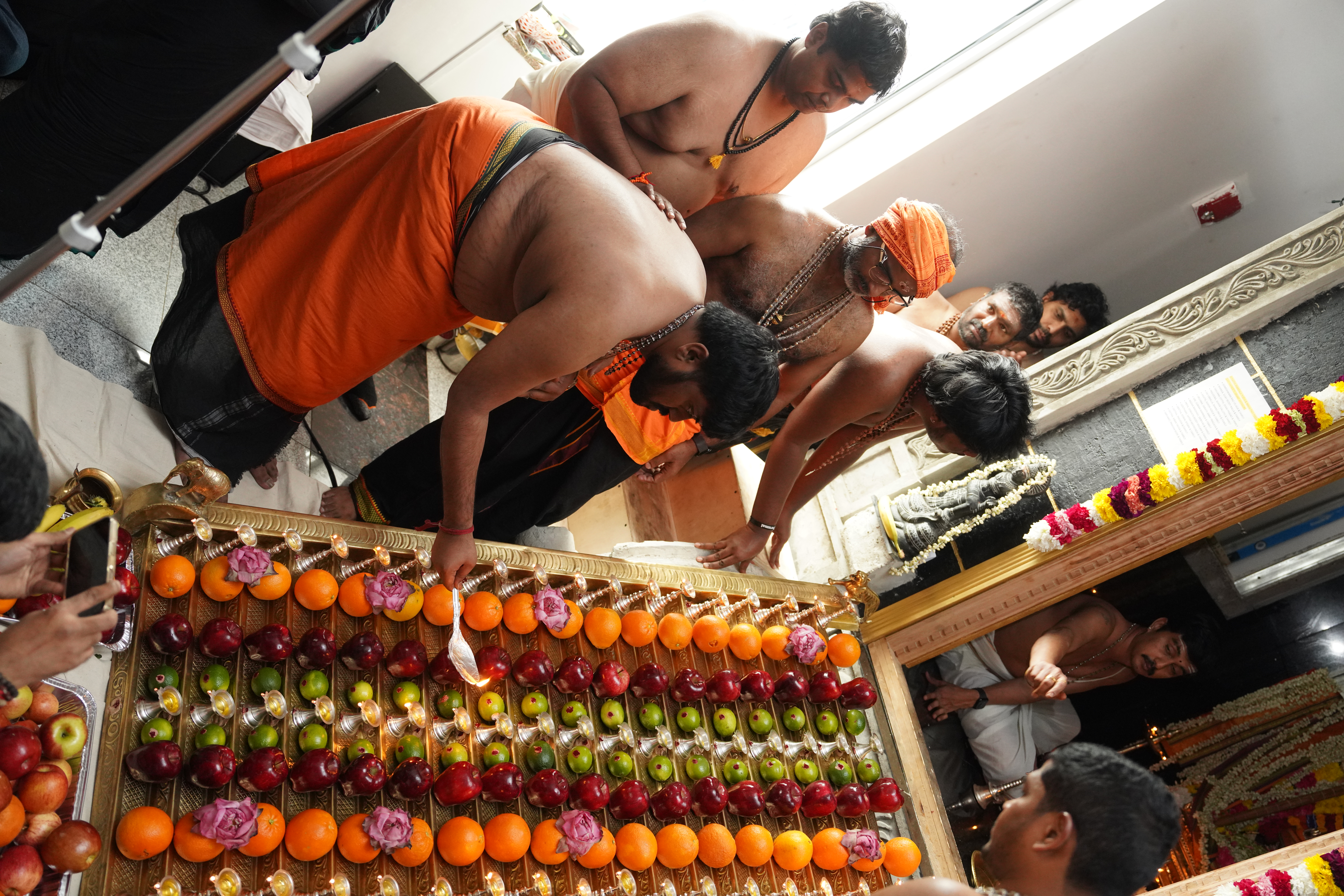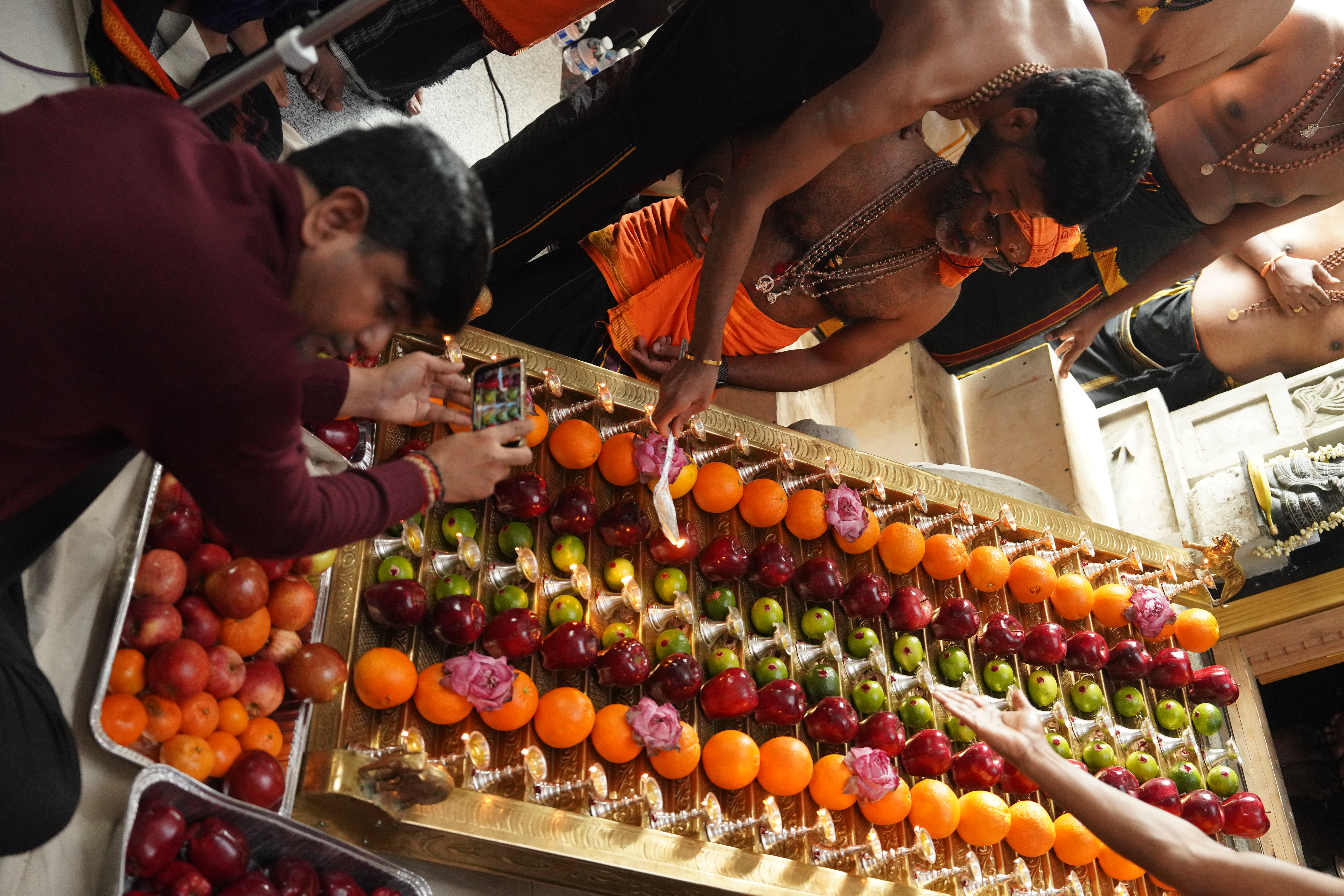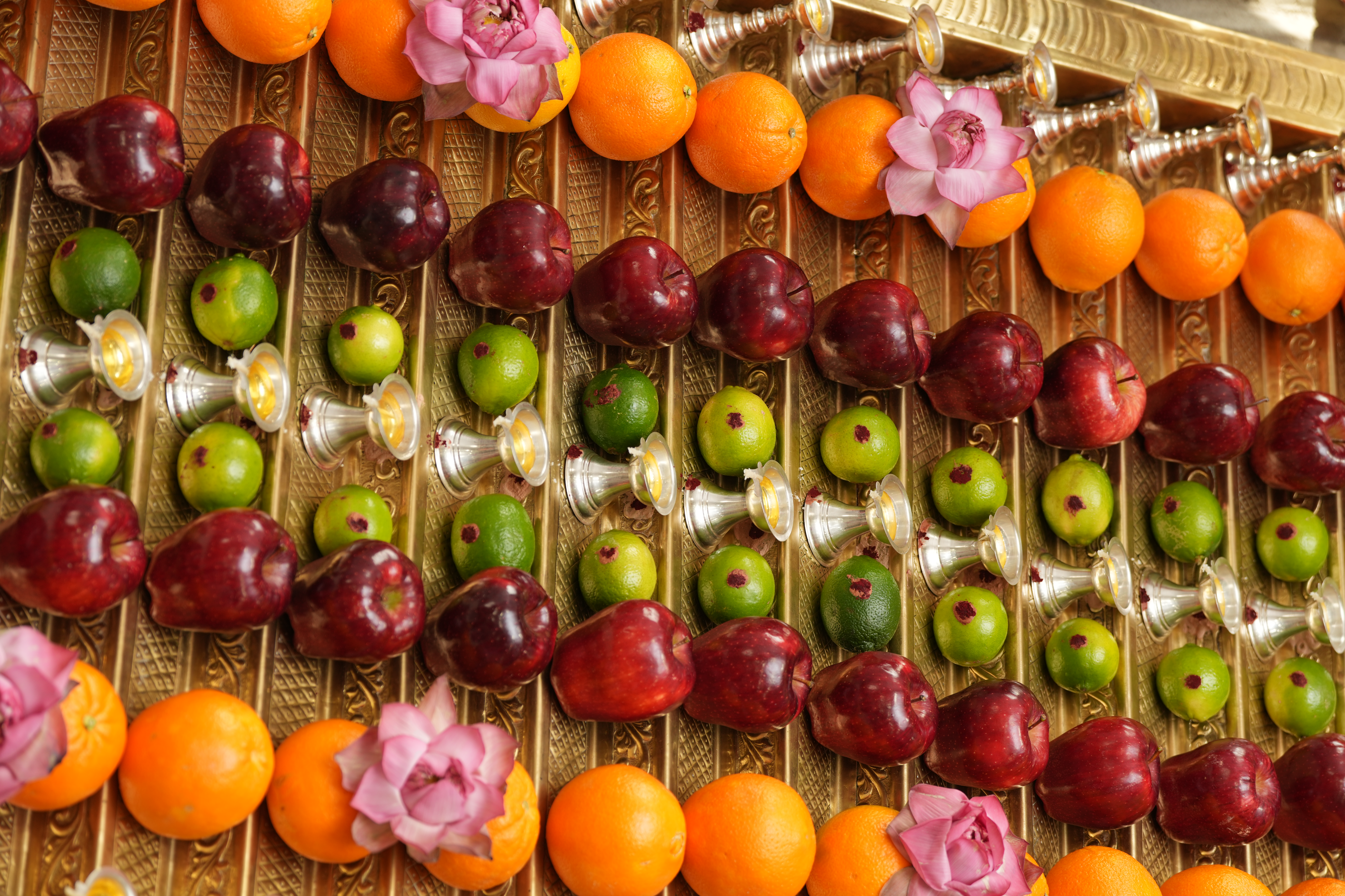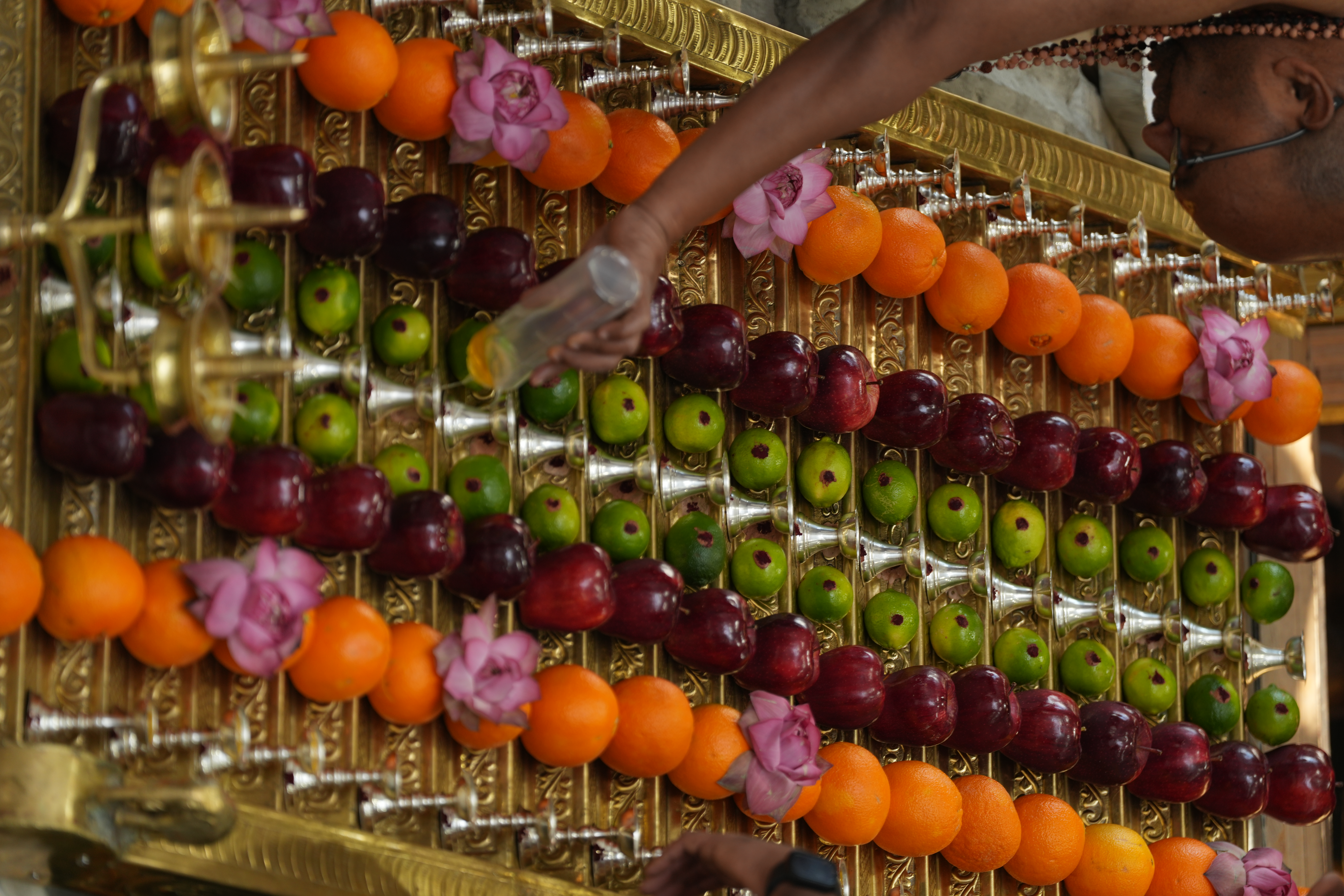 Sprinkle theertham (holy water) on fruits, jaggery, and bananas while chanting: