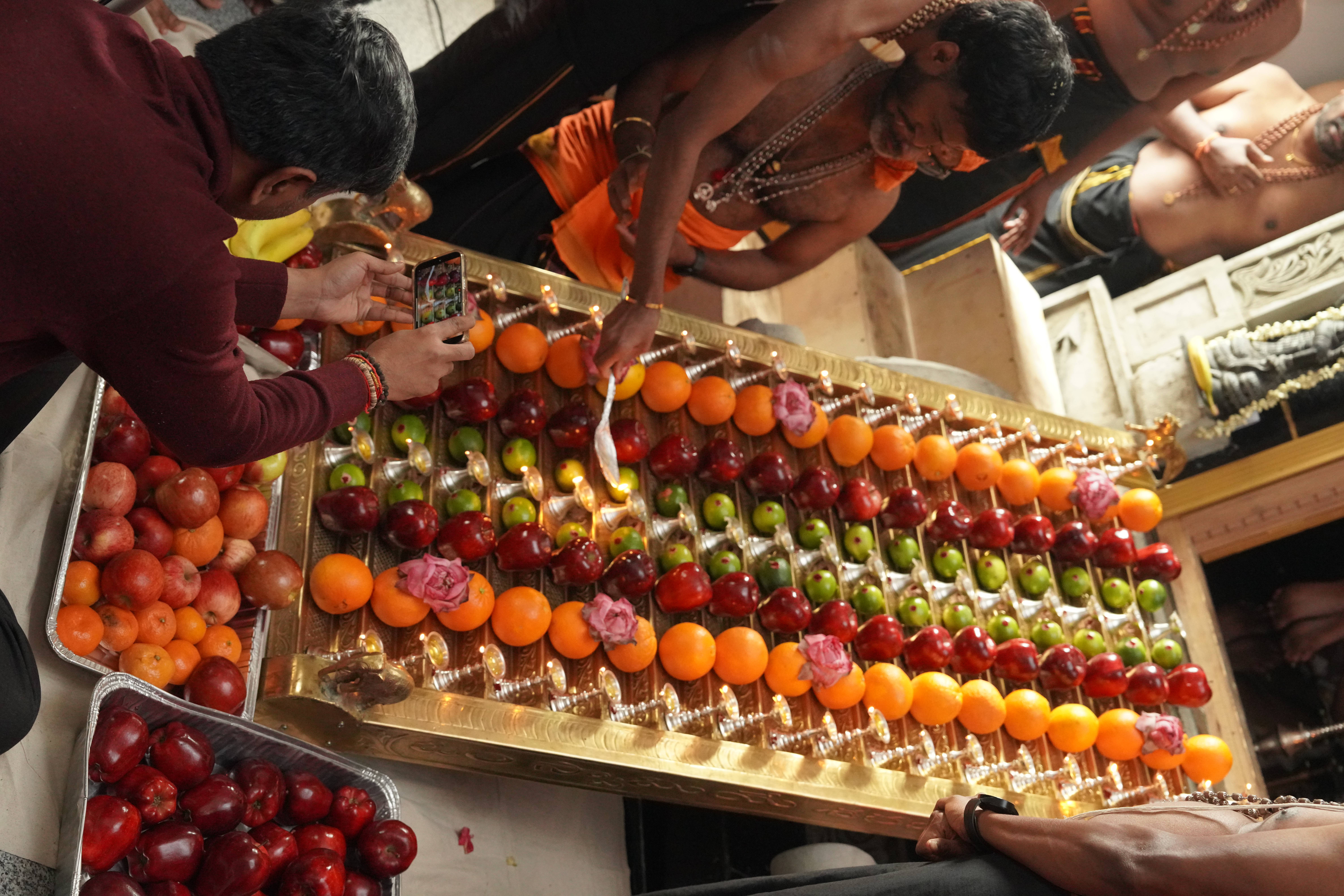 “Karpoora Neeranjanam Samarpayami.” (Offer camphor light)